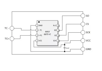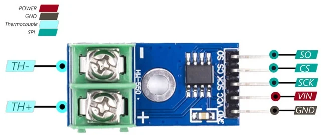 Max6675 Schematic:Important Note: Most K thermocouples come with a red lead and a yellow lead.  The red lead is normally your negative connection and the yellow lead is your positive.  That is the industry standard. That said, some of the suppliers for the module will, in fact, jack this up and provide you with a thermocouple with red indicating positive. The way to know is if you increase the temperature at the thermocouple tip and the indication goes lower.
